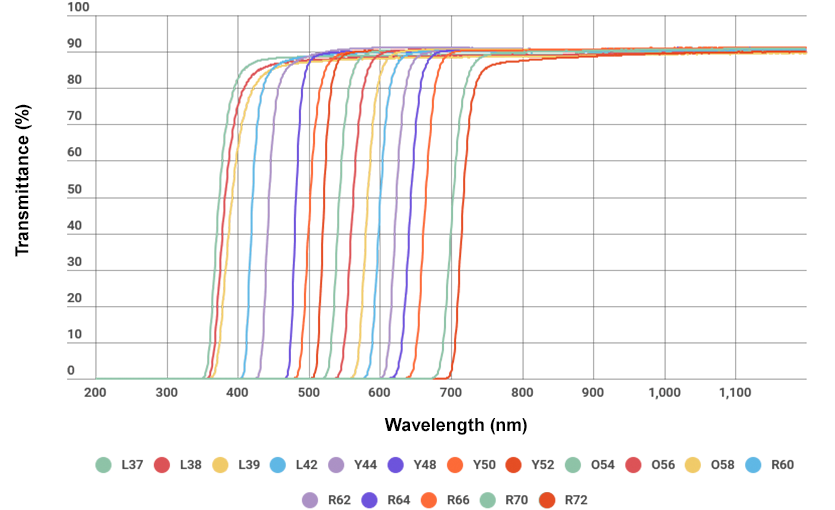 Sharp cut filters are longpass filters that cut off the wavelength light shorter than a specific wavelength as much as possible, while transmitting the longer wavelength light as much as possible, within a wavelength range of 350 nm to 800 nm.