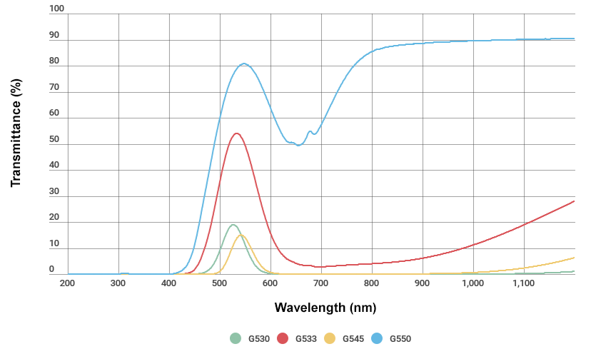 Bond these filters and sharp cut filters together to attain the maximum transmittance at a specific wavelength or to absorb light of shorter wavelengths.