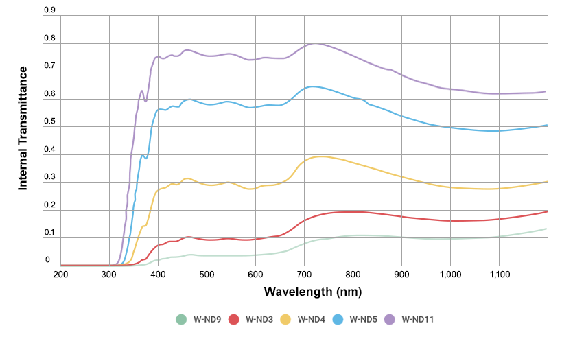 吸収タイプのニュートラルデンシティフィルターであるW-NDシリーズは、特定のOD値または透過率に幅広く対応することが可能です。それらは使用硝材の特性に基づき肉厚を調整することによって実現することができます。