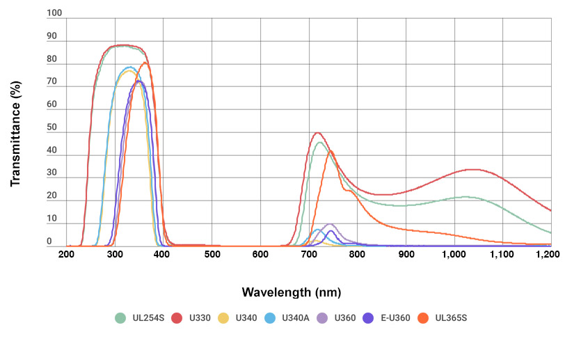 主として紫外線のみを取り出すときに用います。水銀灯の代表スペクトル線である253.7nmや365nmの波長を選択的に透過させることができます。