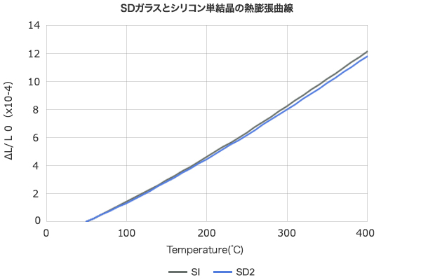 熱膨張特性をシリコン単結晶に一致させてあります。そのため、歪みの少ない陽極接合が広い温度範囲で行えます。